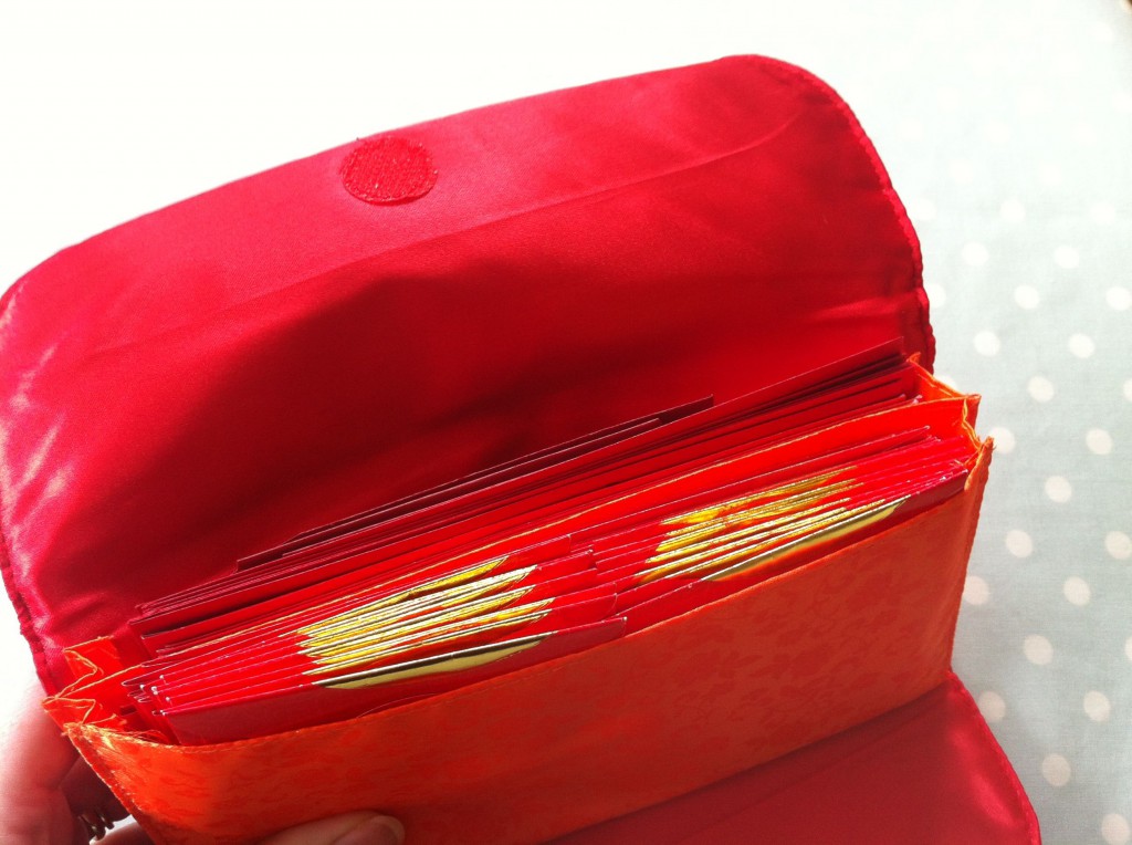 It’s really quite obvious: differently sized and differently coloured packets for different amounts and a special ang pow wallet – above and below – to hold them all in (and to stop your handbag becoming like a lucky dip with a jumble of denominations: year one’s mistake).