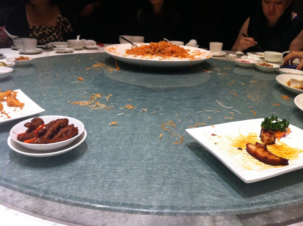 The fall-out after the lowing has taken place is always a marker for the group enthusiasm for the dish. This is our effort after a lunch for ten at the Super Peking Duck restaurant in Paragon: